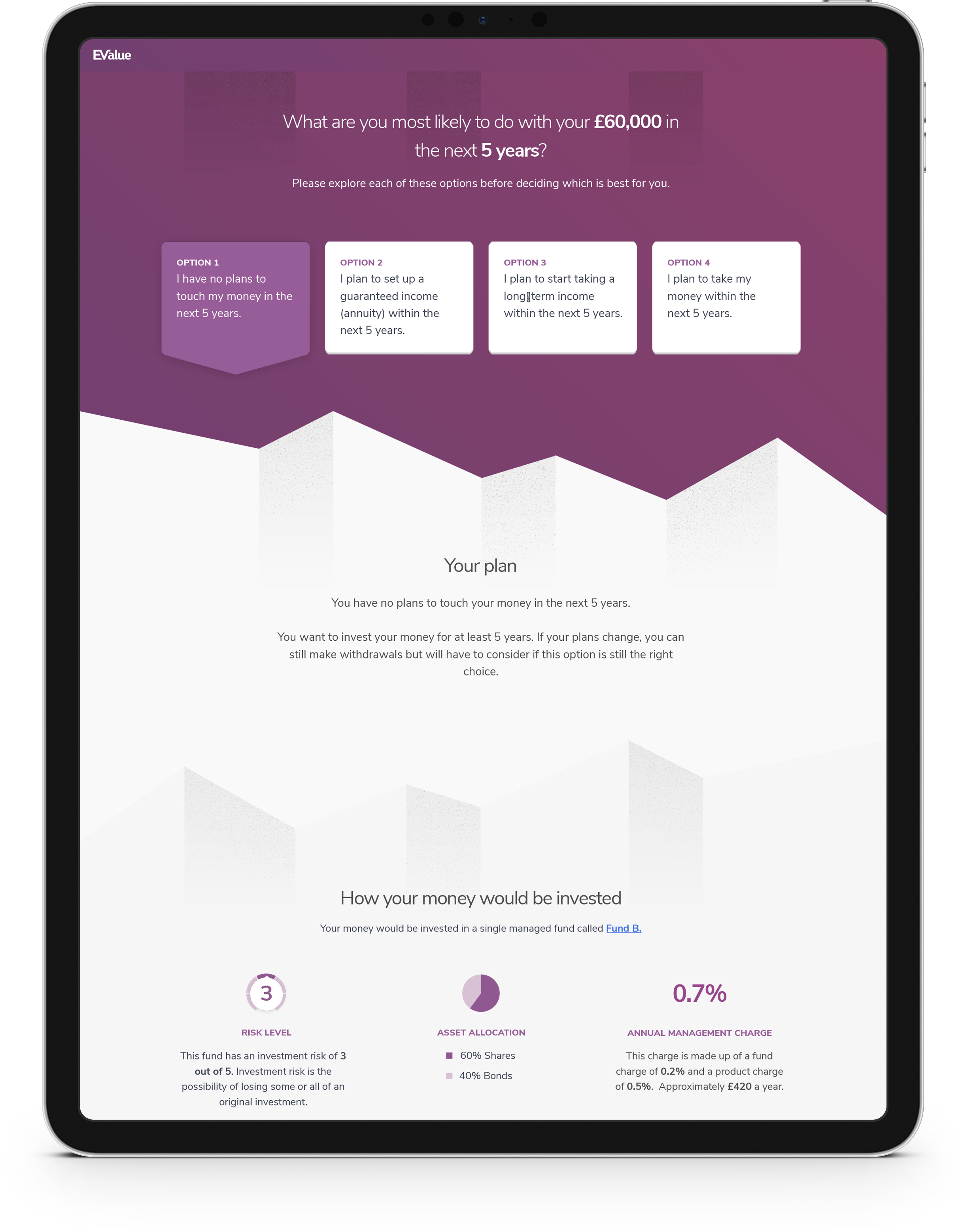 Our client, a global asset manager, wanted to build an automated advice process that included the explanation and calculation of risk and reward for each investment. They had created various tools and calculators before, but they hadn’t yet given advice in this way.